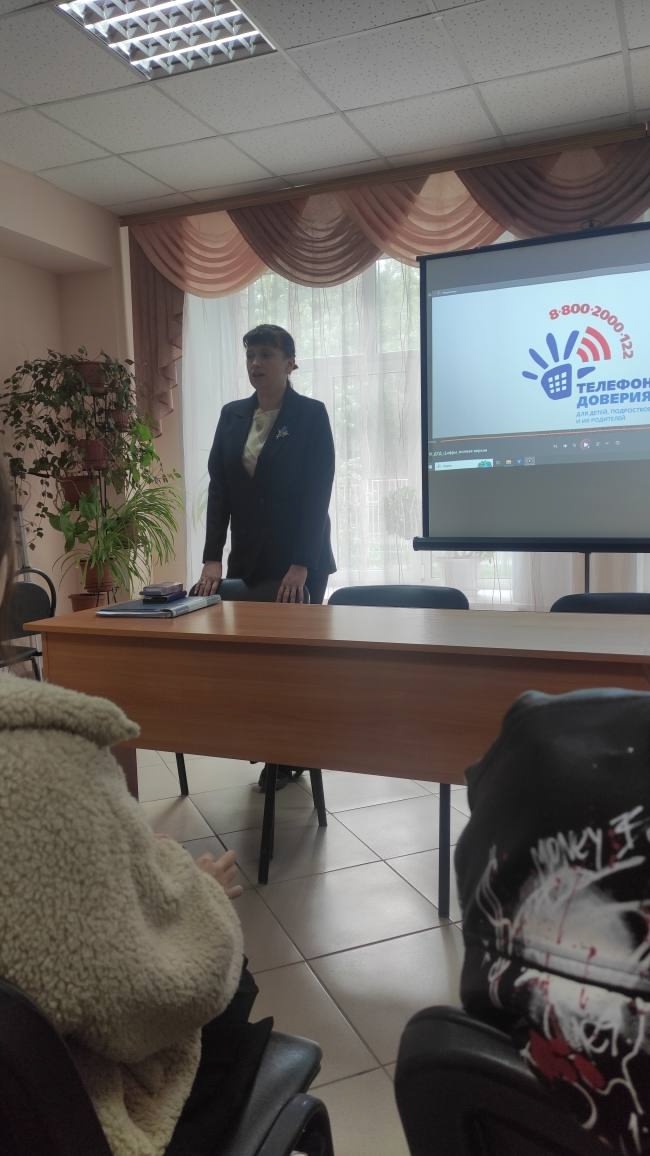 Психолог центра, кандидат психологических наук Ольга Антонович познакомила студентов с основными направлениями работы Центра, обозначив актуальность и востребованность психологической помощи посредством службы "Телефон доверия", а также через личные консультации.