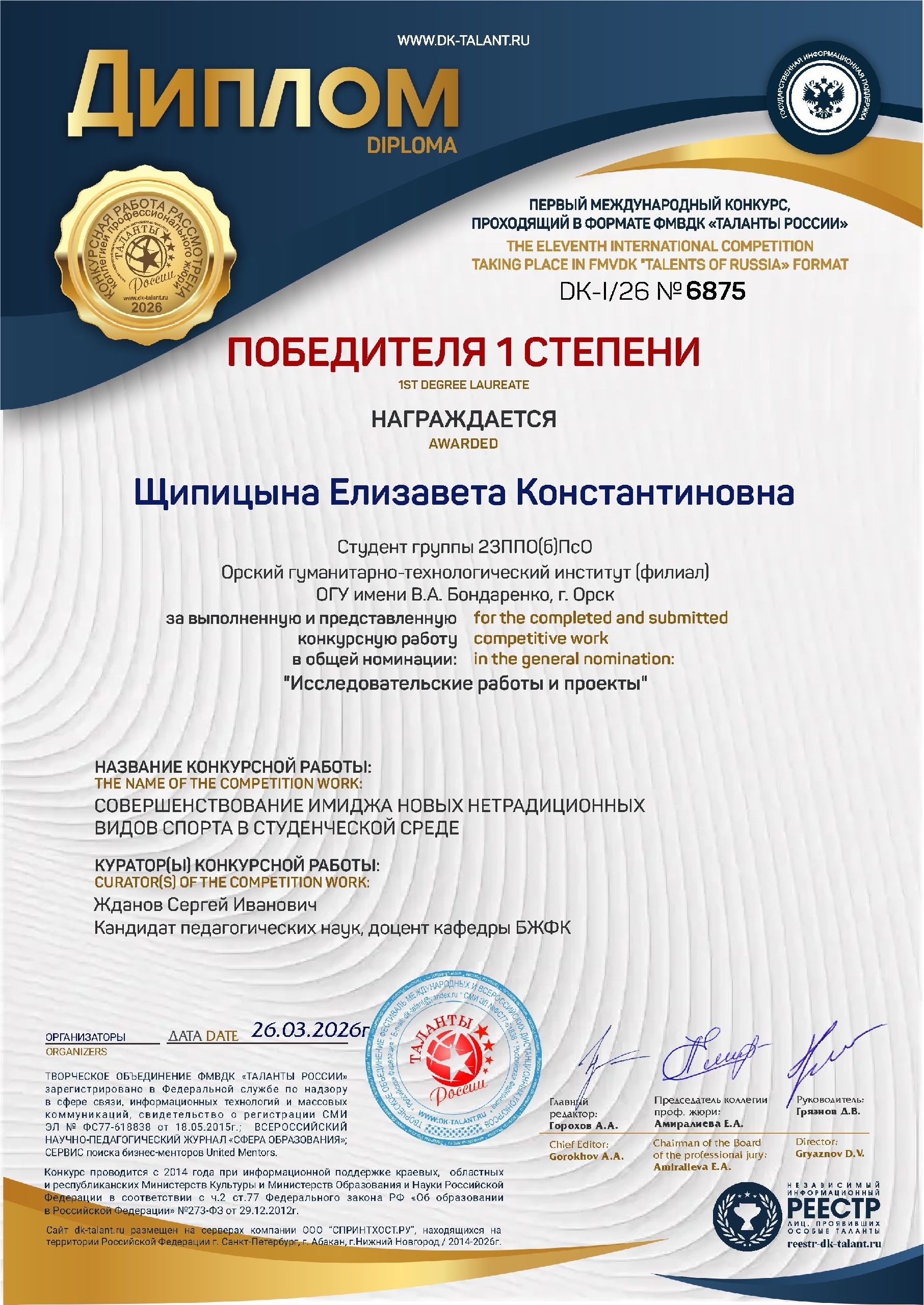 В Нижнем Новгороде 26 марта 2026 года состоялся Международный конкурс, проходящий в формате ФМВДК «Таланты России».